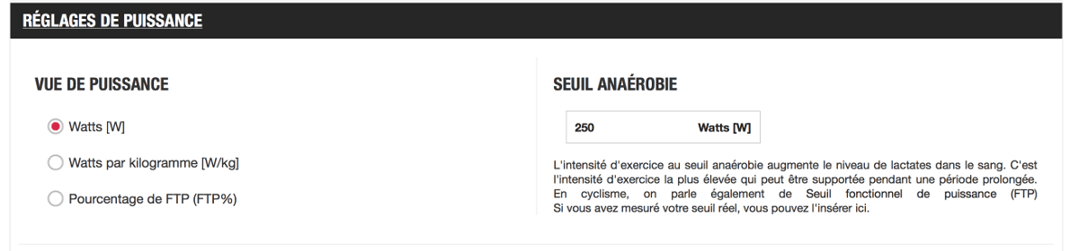 La valeur FTP est configurée par profil d’activité, elle doit être renseignée dans chacun des profils utilisés en cyclisme dans la partie « Réglages de puissance »:
