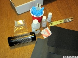 Tout le matériel est fourni dans le kit de réparation carbone (voir en fin d’article pour le détail), et entre autres le papier de verre fourni dans différentes finesses. On y voit également la résine Epoxy ainsi que le durcisseur, la trame de carbone (dans le tube en plastique), les pinceaux et mélangeurs et même les gants: