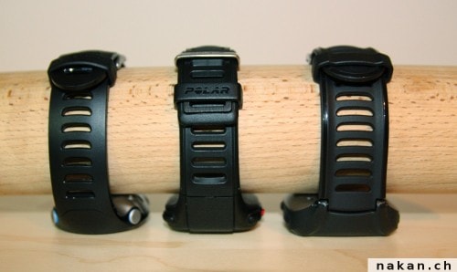 La Garmin Forerunner 910XT (à droite) comparée à la Forerunner 610 (à gauche) ainsi qu’à la Polar RC3 GPS (au centre):