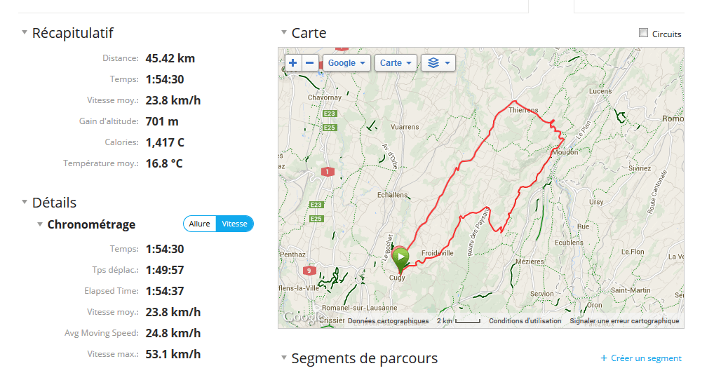 Ensuite, les graphiques, avec l’allure. Notez également dans la partie de gauche les résumé de température et de cadence de course, bien que je n’aie pas porté de capteur de FC pour cette activité: