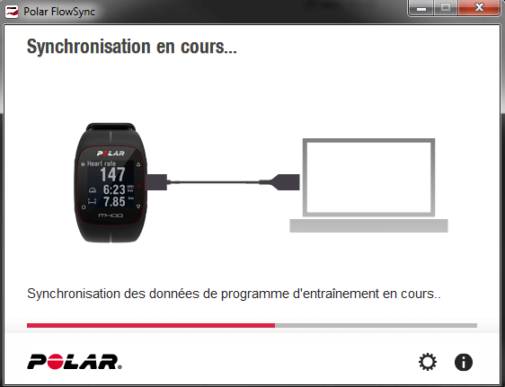 Il est également possible de synchroniser la M400 à l’aide du logiciel Polar Flow Sync, pour Mac ou Windows. On connecte alors simplement la montre à l’aide du câble USB à l’ordinateur, et le logiciel s’occupe du reste: