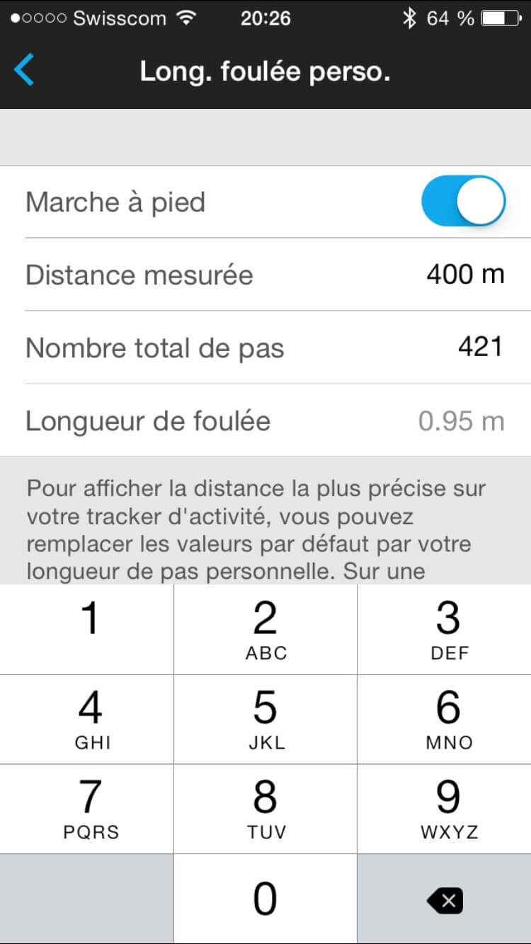 En utilisant le nombre de pas, le tracker d’activité va calculer la distance parcourue à pied. Lors d’utilisation du GPS pour une séance de course à pied par exemple, la distance est généralement correcte, mais pour une meilleur précision lors de la mesure avec uniquement l’accéléromètre interne, il est possible de mesurer le nombre de pas nécessaires pour une distance donnée, afin d’étalonner correctement le tracker. Le plus simple est de trouver une piste d’athlétisme, et d’effectuer un tour de 400m (ou n’importe quelle distance connue) et de compter le nombre de pas. Ensuite, dans l’application Garmin Connect Mobile, dans la section « appareils », choisissez le tracker puis dans « Informations personnelles -> Long. de foulée perso. », entrez les valeurs mesurées: