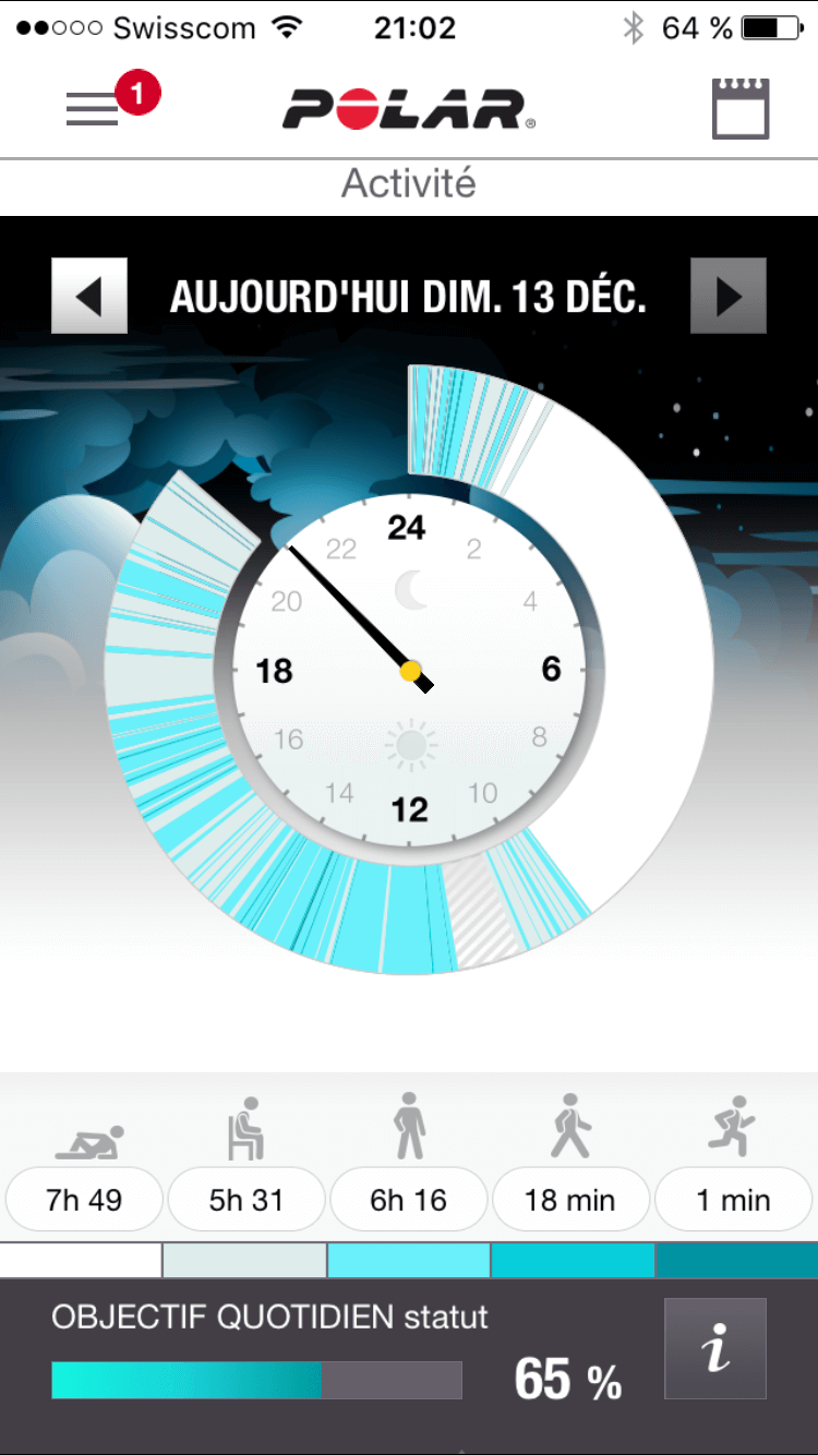 La fonction principale du A360 est évidemment de quantifier tout au long de la journée le niveau d’activité. Ceci est calculé d’après les réglages définis lors de la configuration initiale (modifiable ensuite sur Polar Flow) de la journée type. Tout au long de la journée, le pourcentage d’accomplissement de l’objectif va augmenter.