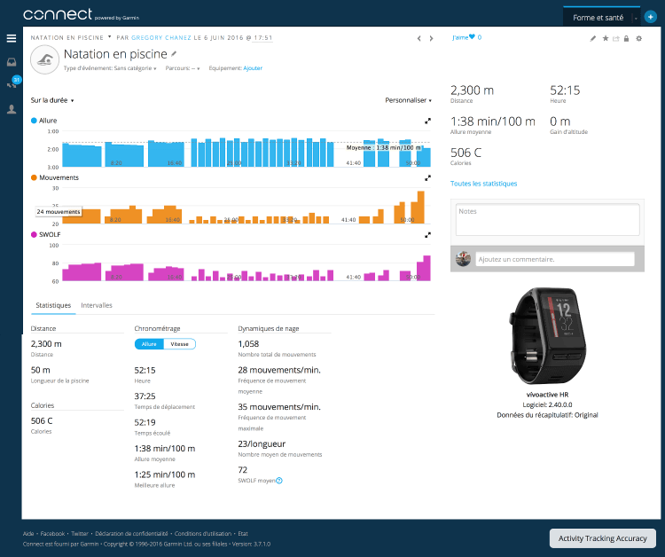Une fois l’activité enregistrée, voici les infos que l’on obtient dans Garmin Connect: