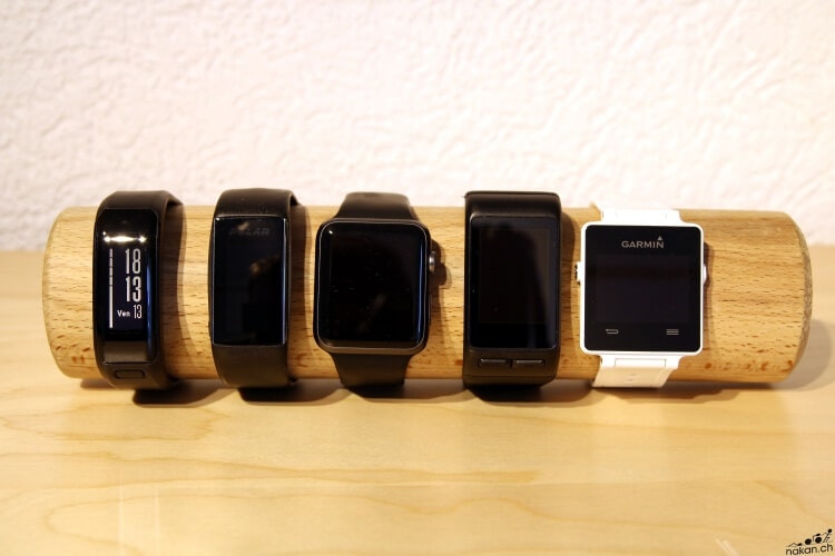De gauche à droite: le bracelet Garmin Vivosmart HR, le bracelet Polar A360, l’Apple Watch Sport, la Vivoactive HR et la Vivoactive de première génération. Les mêmes montres vue de profil: