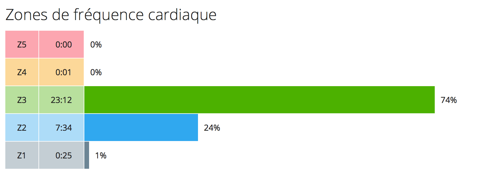Enfin, le dernier onglet contient le temps passé dans chaque zone de fréquence cardiaque: