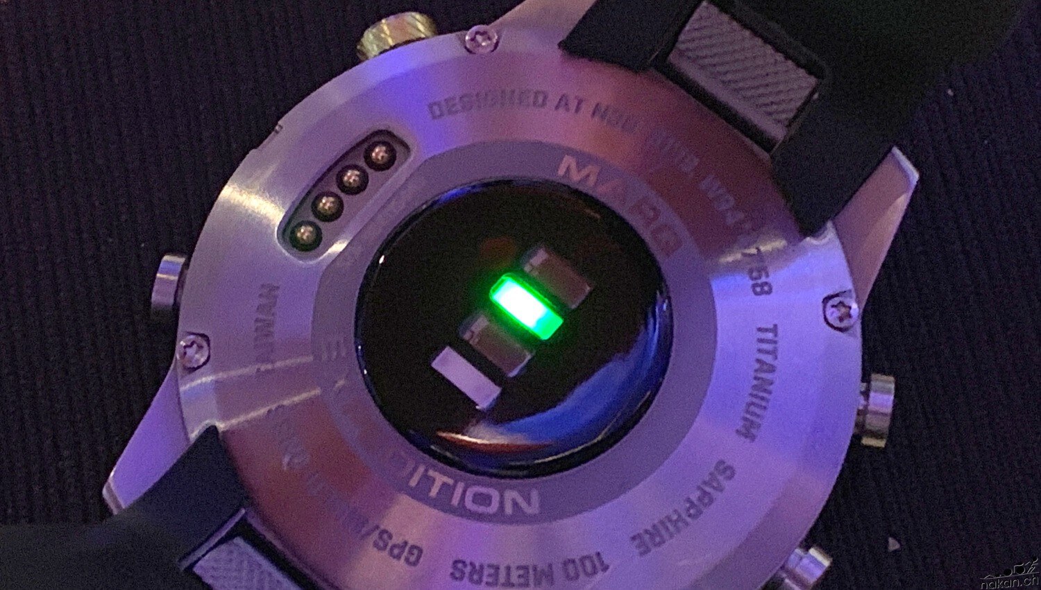 Ce capteur est également équipé de la fameuse LED rouge qui est apparue sur la fenix 5X Plus, qui permet de mesurer la saturation d’oxygène sanguine. Tous les modèles de MARQ sont donc aussi capables d’effectuer cette mesure (cette LED rouge n’est pas visible ici):