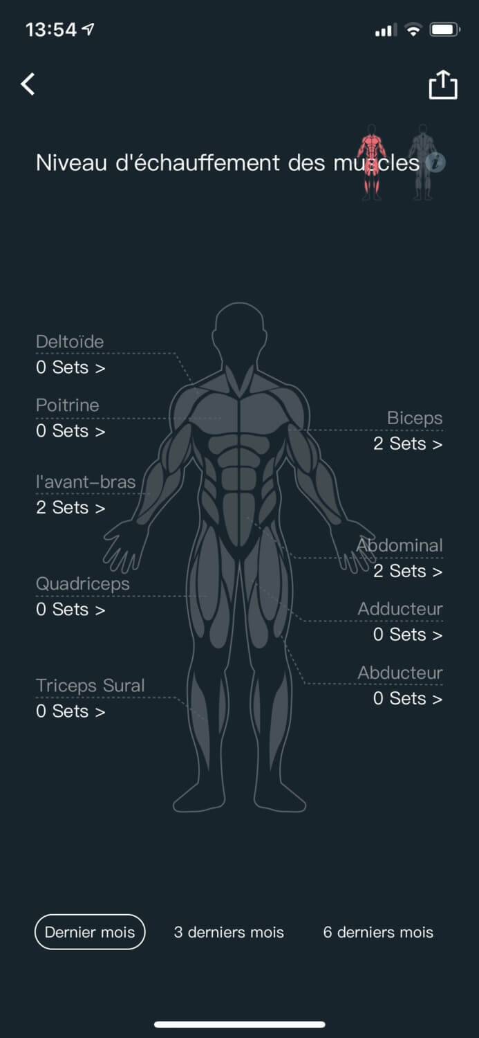 Une fois l’entrainement terminé, on retrouve dans l’application le récapitulatif des zones travaillées ainsi que du nombre de répétitions: