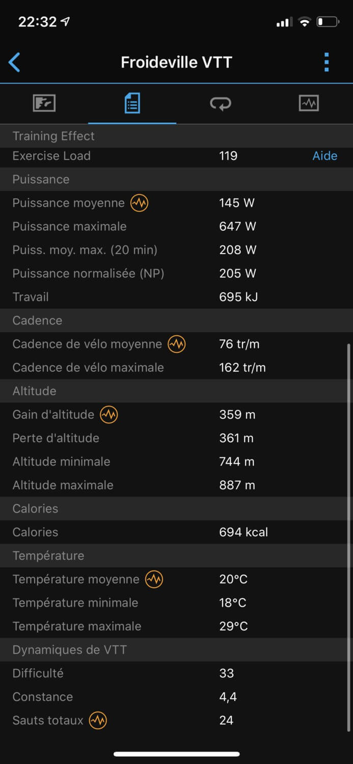 - Puissance (ne contient pas les métriques TP type puissance normalisée, NP, TSS…)