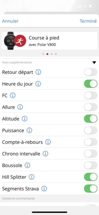 Désormais, une nouvelle entrée dans le menu général de la Vantage V2 permet de choisir quels widgets on souhaite activer ou désactiver. Ainsi, seules les données qui nous intéressent vraiment sont disponibles sous le watchface: