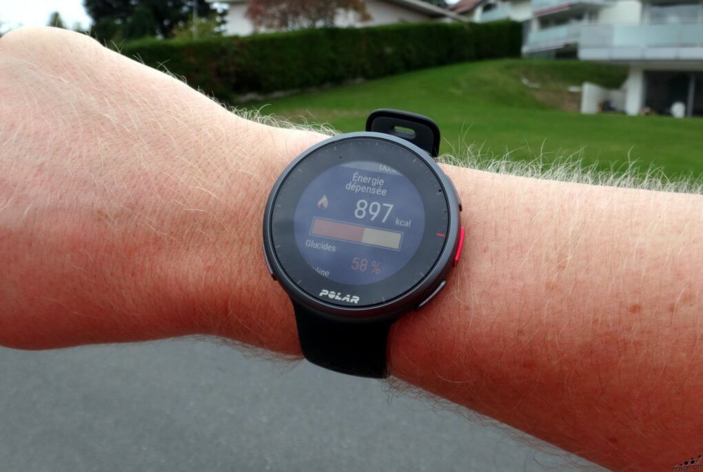 La montre offre possibilité de voir immédiatement l’autonomie estimée en heures après un changement de configuration sur l’écran de pré-entrainement, à côté de la batterie: