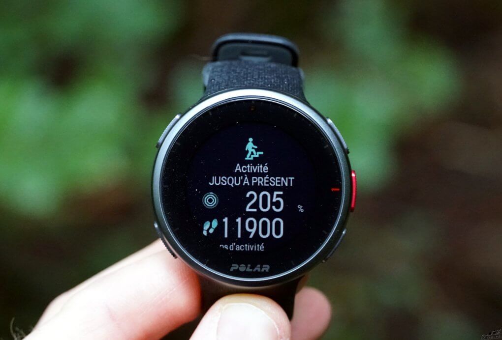 La présentation des données de widgets des dernières montres de Polar reste identique sur cette nouvelle Vantage V2. On fait ainsi défiler les données des widgets sous le cadran du watchface. Deux changements importants: Polar a ajouté de nouveaux widgets, et surtout la possibilité de choisir ceux que l’on veut activer dans le menu de la montre.