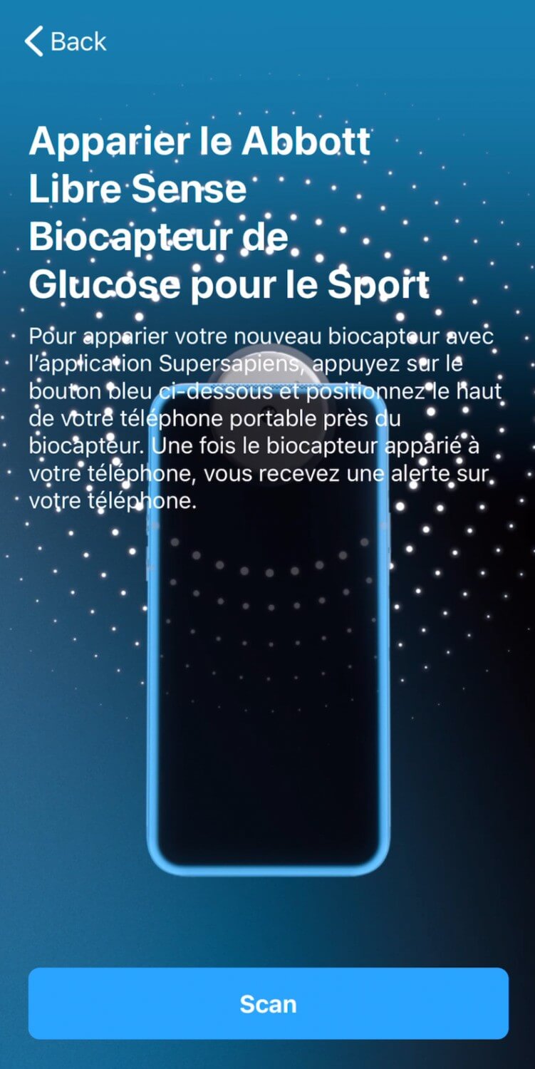 La collecte des données du capteur permet d’alimenter l’application Supersapiens sur le smartphone. C’est ici que les données sont centralisées et analysées. Elles peuvent ainsi être mises en perspective avec des repas, des activités sportives ou d’autres événements. Enfin, pour que le biocapteur se mette à fournir des données, il est nécessaire de le scanner à partir de l’app!