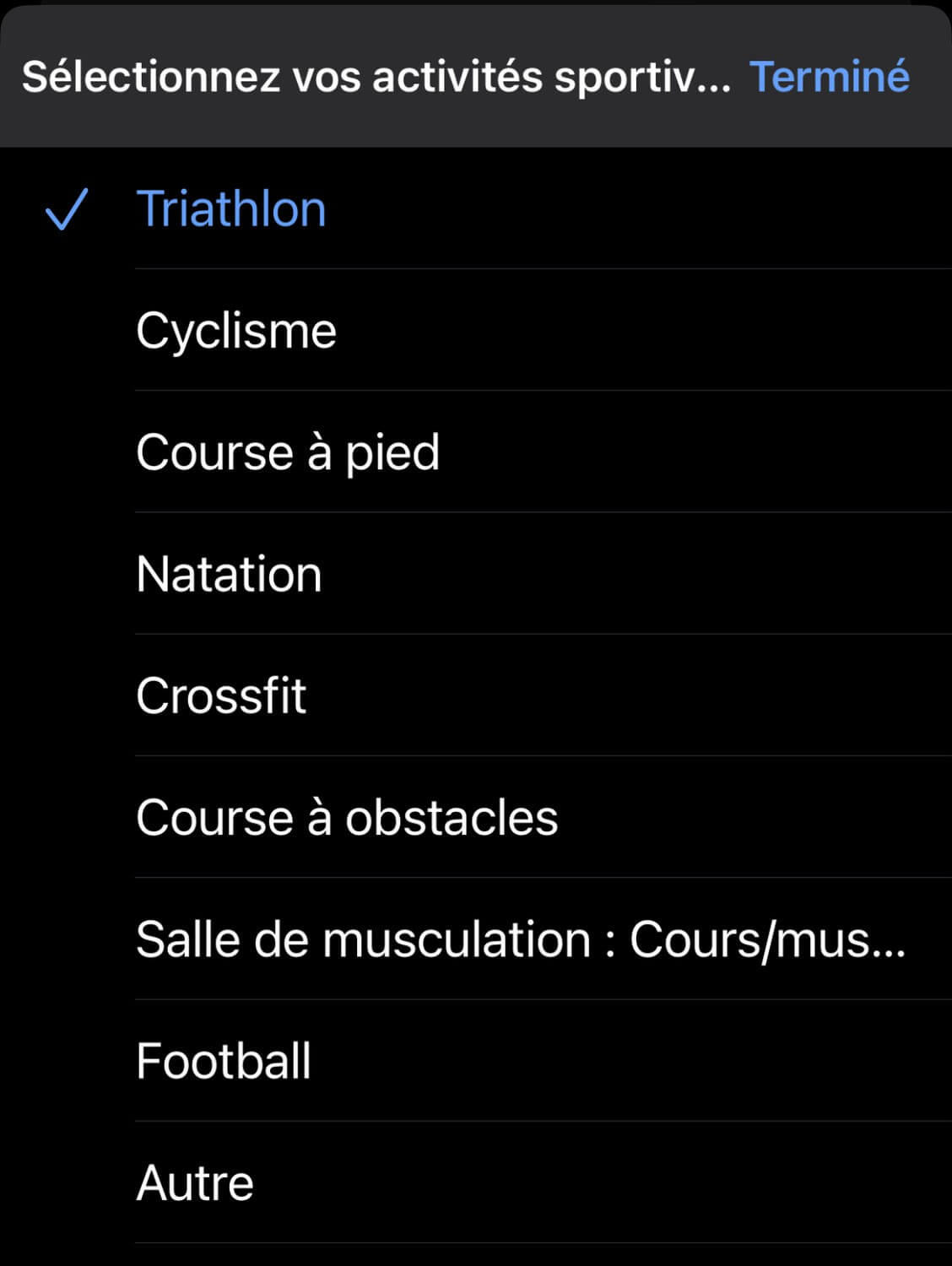 Pour les événements sportifs, il est possible de coupler l’app Supersapens à Apple Santé. Au moment de rédiger cet article, je crois que c’est la seule source de données disponible. Une fois le lien établi, les activités sportives récupérées dans Apple Santé sont automatiquement ajoutées comme événements dans la timeline: