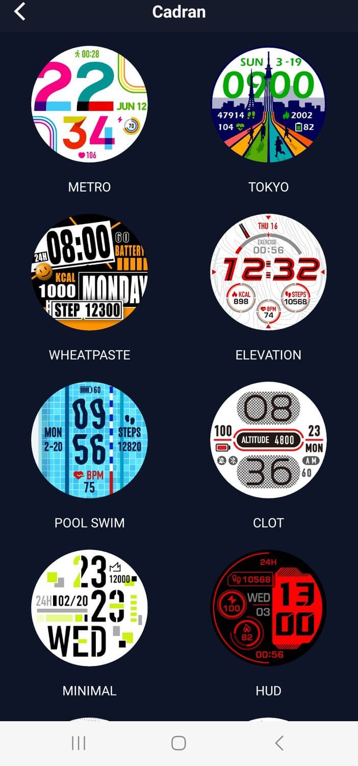 Comme pour les autres montres Coros, il est possible dans l’app de changer le cadran d’heure, et d’en choisir un parmi ceux qui sont proposés par la marque. En voici quelques exemples: