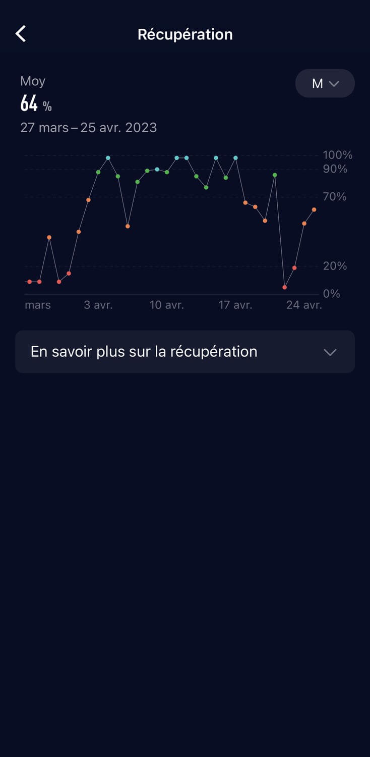 Dans la partie récupération, l’app nous indique un taux de récupération par rapport aux 90 derniers jours d’entrainement. Il est possible d’afficher le statut actuel ainsi que l’évolution de la récupération pour les 7 ou 30 derniers jours: