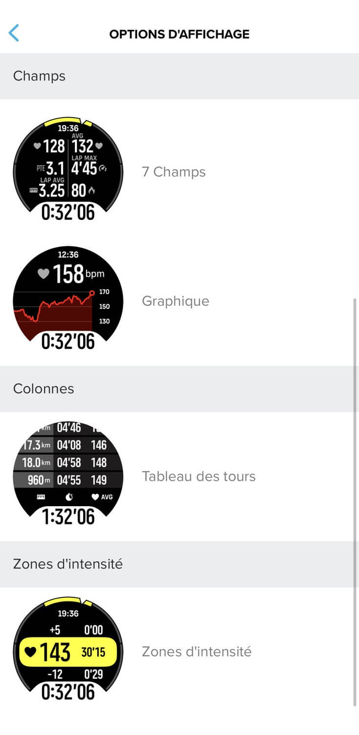 on revient à une montre avec un affichage simple (et pas 15 pages avec différentes informations) cela nécessite en amont de réfléchir comment on souhaite utiliser la montre lors d’une activité et ce qui est pertinent !