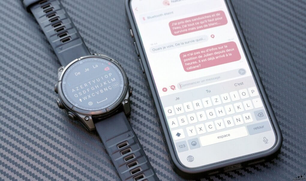 Garmin Messenger permet d’échanger des messages, que ce soit via l’app mobile sur le smartphone ou via la montre. L’application utilise toutes les connexions disponibles, que ce soit celle du téléphone ou de la montre pour envoyer les messages. Il est par exemple possible d’écrire un message sur le téléphone même si ce dernier ne dispose d’aucune connexion. Le message est alors envoyé via la montre, par LTE ou satellite.