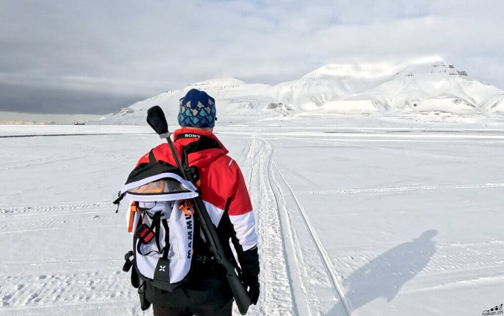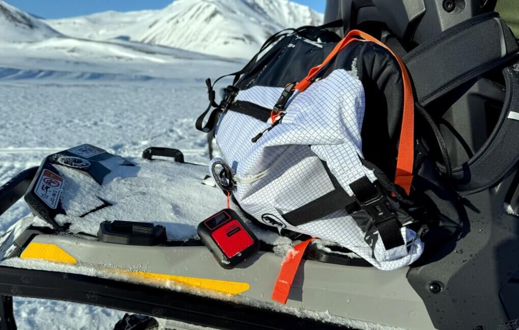 Dans la pratique, avec un appareil inReach qui utilise le réseau Iridium, on ne se préoccupe pas de la position ou de l’orientation de l’antenne de l’appareil. Si la vue sur le ciel est dégagée, il suffit de l’accrocher à son sac à dos comme je l’ai fait à Svalbard, aussi bien en randonnée qu’à l’arrière de la motoneige. Et l’appareil est capable d’envoyer et recevoir des données comme le suivi en temps réel, ou des messages.