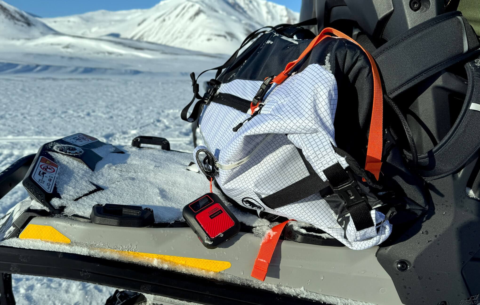 Dans la pratique, avec un appareil inReach qui utilise le réseau Iridium, on ne se préoccupe pas de la position ou de l’orientation de l’antenne de l’appareil. Si la vue sur le ciel est dégagée, il suffit de l’accrocher à son sac à dos comme je l’ai fait à Svalbard, aussi bien en randonnée qu’à l’arrière de la motoneige. Et l’appareil est capable d’envoyer et recevoir des données comme le suivi en temps réel, ou des messages.