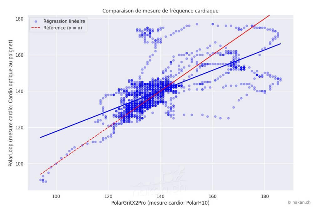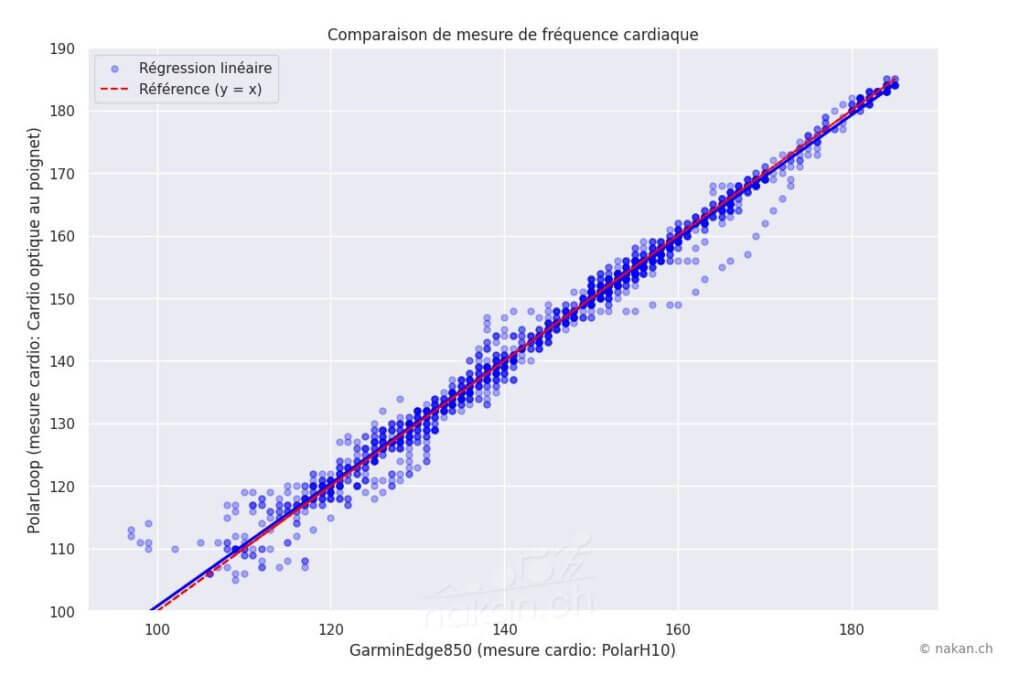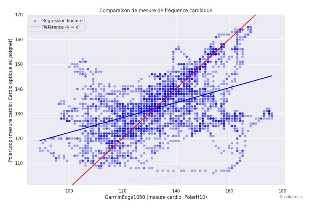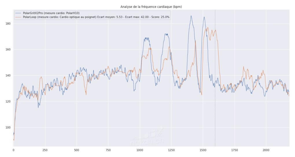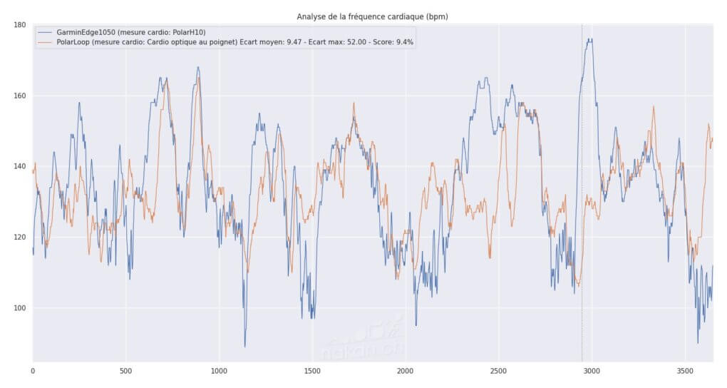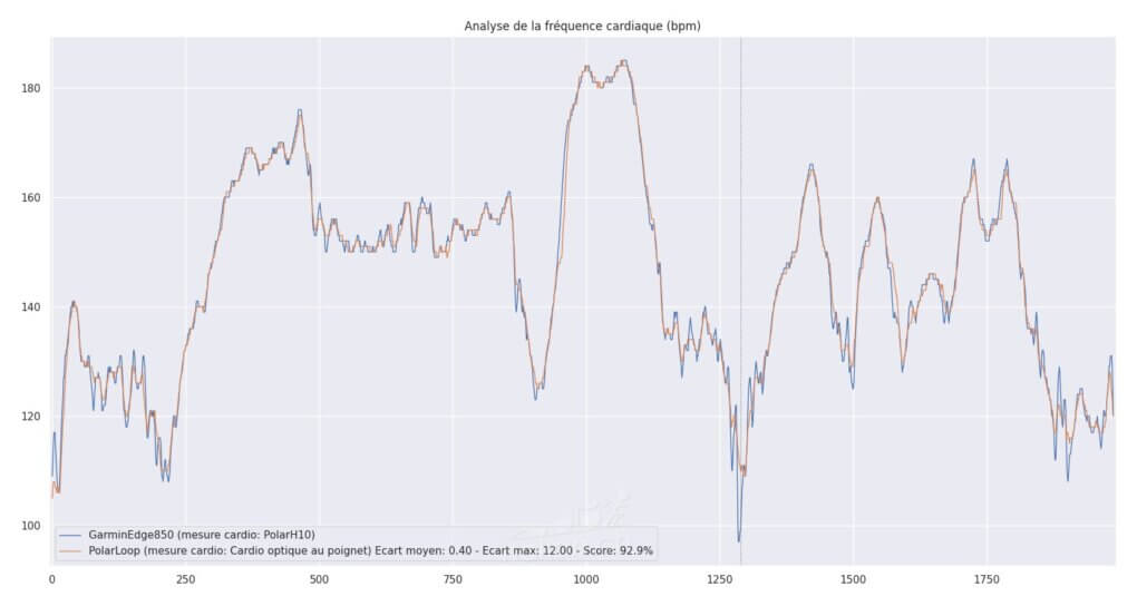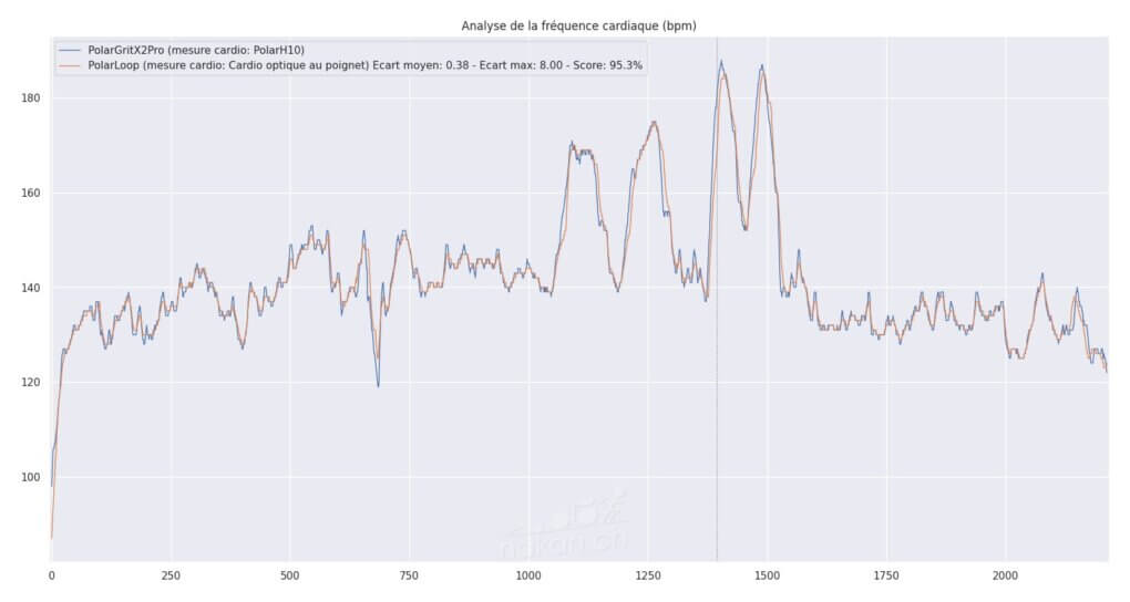 Plus de 90%. Seules les subtiles variations dans les descentes ont généré un écart de 12bpm. Sur ce type d’activité, c’est véritablement une excellente mesure pour un cardio optique. Ca se confirme avec cette vue: