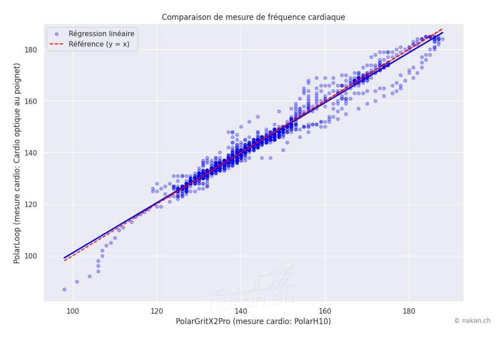 Note concernant le score de chaque comparatif (depuis début 2022): Afin de quantifier la précision de la mesure, un score de précision est calculé pour certains comparatifs de mesure cardio entre deux types de mesure. Ce score est obtenu en pondérant l'erreur de mesure moyenne lors de chaque relevé (en principe chaque seconde) avec un poids supérieur pour les erreurs les plus importantes. En règle générale, deux ceintures pectorales de qualité identique comparées entre-elles obtiennent un score situé entre 95 et 99%.