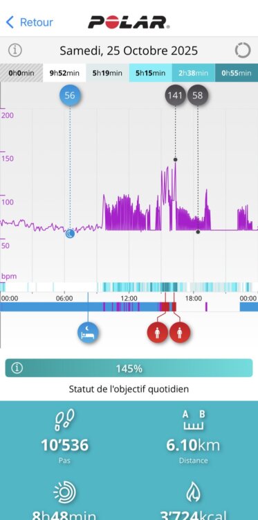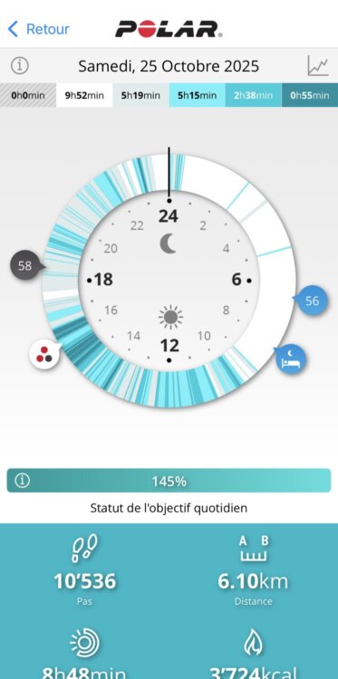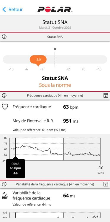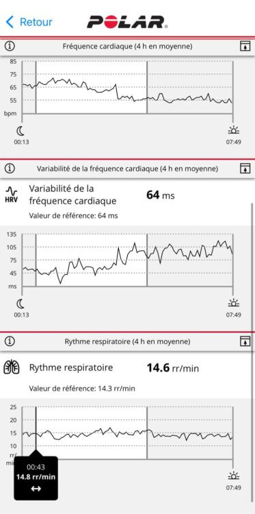 Cest vues n’ont rien de mauvais en soi. Le seul problème, c’est que ce sont les seules disponibles… Il manque cruellement de consolidation de données sur des périodes plus longues. Impossible de voir l’évolution de ma VFC nocturne sur 14 jours. Impossible de voir des tendances d’activité quotidienne. C’est dans l’analyse synthétique et dans l’analyse sur des durées longues que Polar a tout à faire…
