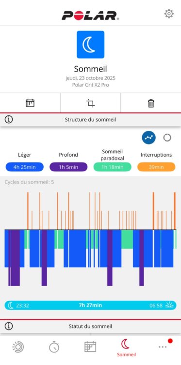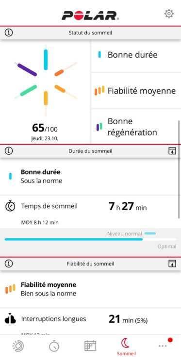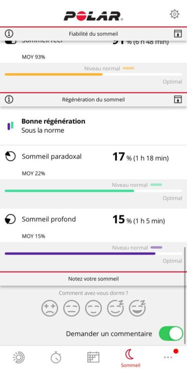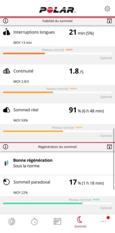 En ce qui concerne les données de sommeil, on retrouve les données de suivi du sommeil dans une partie de l’app, et les données de Nightly Recharge, soit tout ce qui est issu de la fréquence cardiaque et de la variabilité de fréquence cardiaque dans une autre partie. Voici les données du sommeil: