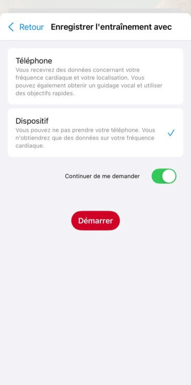 - Lancer l’enregistrement sur le smartphone depuis l’app, et garder le smartphone avec soi pour l’activité sportive. On dispose ainsi d’une trace GPS issue du GPS du téléphone