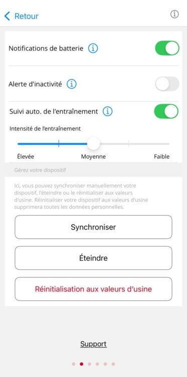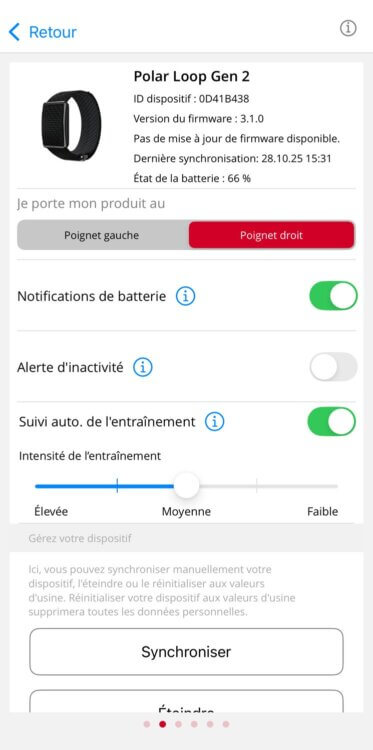 Une fois couplé, le Loop apparaît sous forme de petite fiche sur le haut de la page principale de l’app. De là, on peut aller dans les options et réglages du bracelet pour le configurer, pour lancer une synchronisation ou pour le redémarrer si nécessaire.