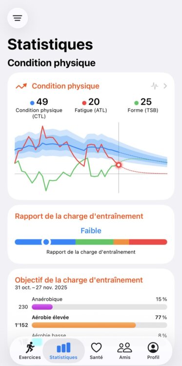 On l’a vu plus haut, c’est ce qui fait défaut dans le suivi sur l’Apple Watch aujourd’hui. On a bien la possibilité après chaque entrainement de renseigner une perception d’effort, et de voir le résultat de la charge sur la montre ou dans l’app Exercice, mais c’est un peu tout…