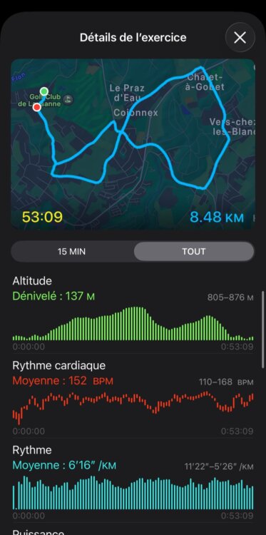 Lors de cette séance de course à pied, j’ai fait varier les intensités, surtout sur la fin, pour voir comment réagissait le capteur de l’Apple Watch Ultra 3 à ce type de séance: