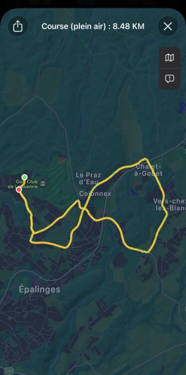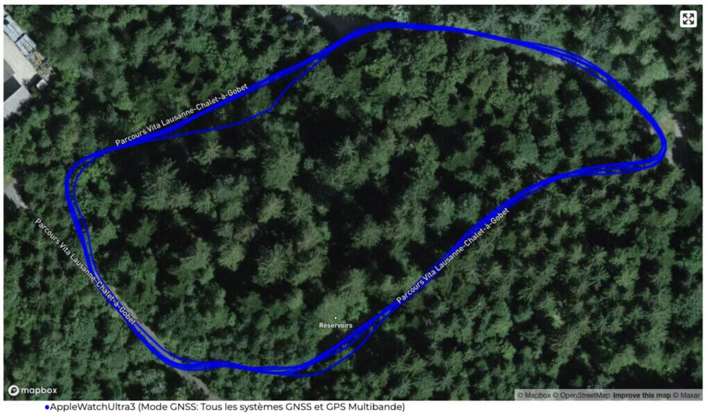 Lors de cette activité, j’ai utilisé mon vélo pour rentrer du travail à travers la ville de Lausanne. La trace de l’Apple Watch Ultra 3 est ici comparée à celle du compteur cycliste Edge 850 de Garmin. Globalement, les deux traces sur l’ensemble du parcours sont très bonnes. Mais on note par endroits des petits écarts de l’Apple Watch qui montre une trace avec très légèrement moins de précision que le compteur. Il faut tout de même garder à l’esprit que la montre était portée au poignet, alors que le compteur était posé sur le guidon!