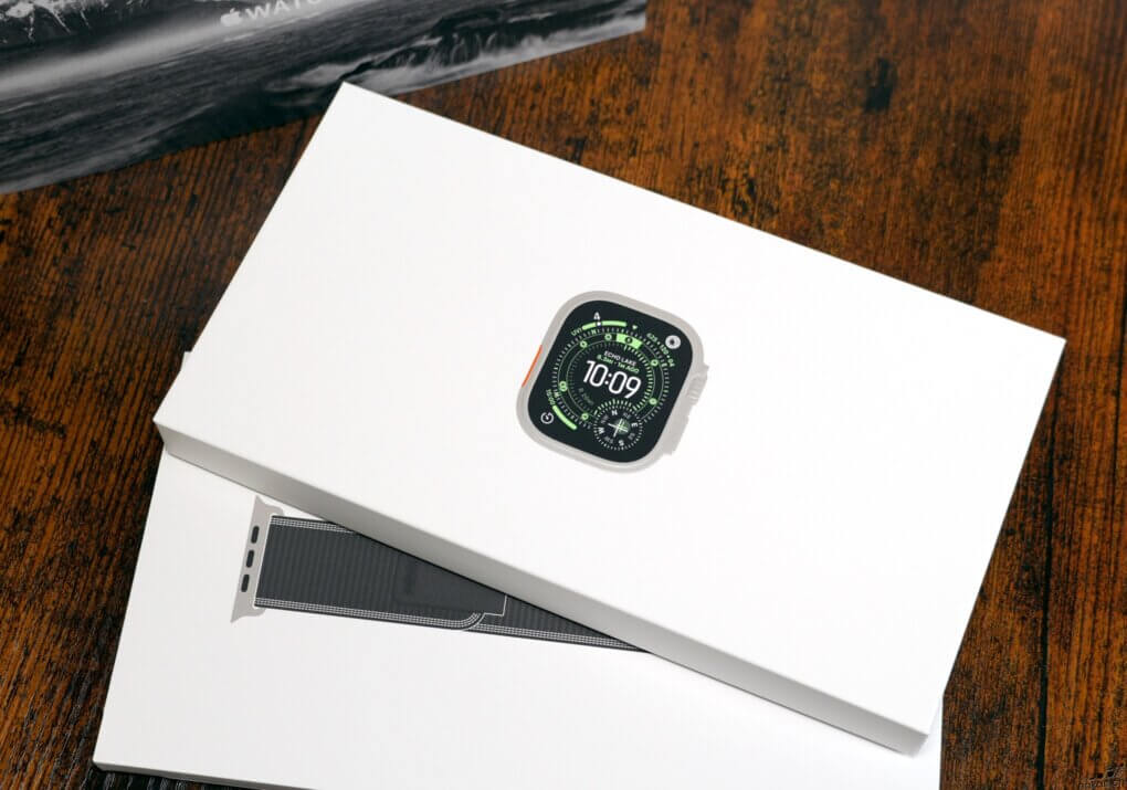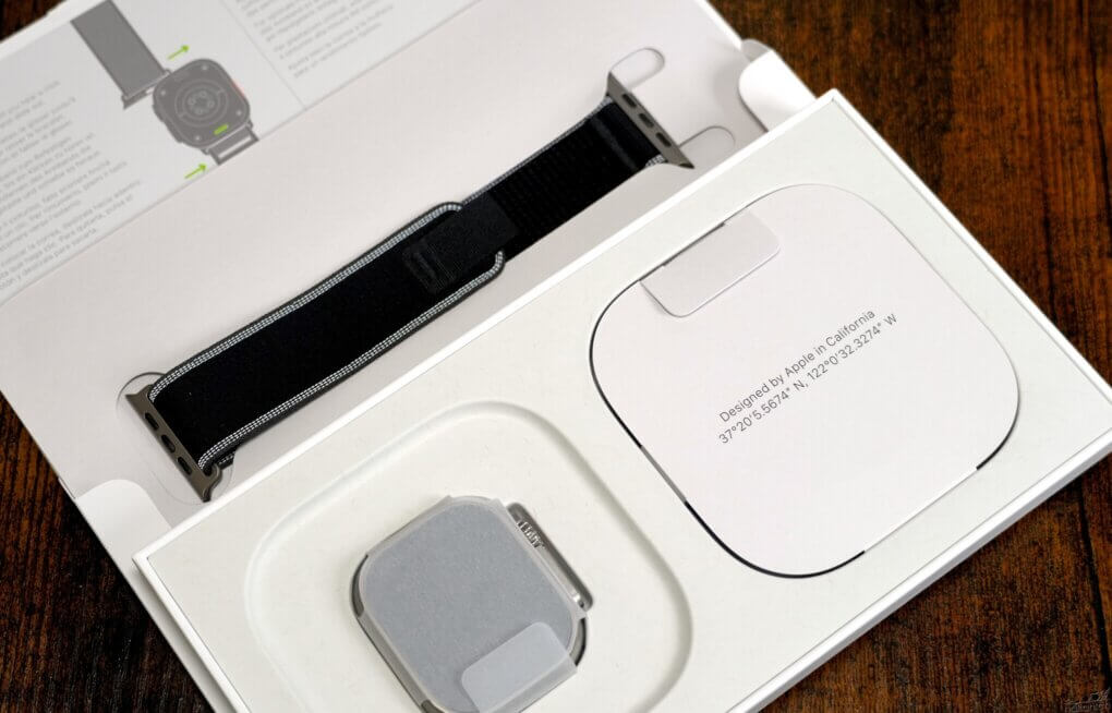 Apple soigne ses packaging et cela se confirme avec l’Apple Watch Ultra 3. Si vous avez, comme moi, choisi la version titane, vous aurez le plaisir de déballer une montre emballée dans un packaging blanc. Si, au contraire, vous avez opté pour l’option noire, alors votre packaging sera assorti à cette couleur: