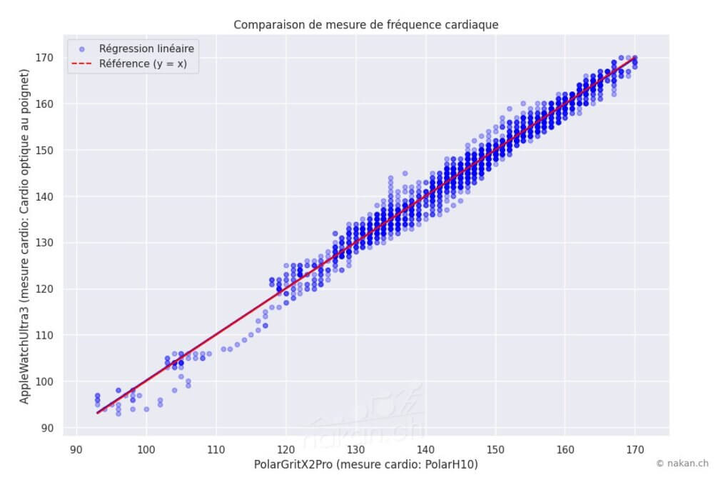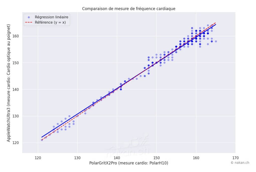 Lorsqu’on regarde le graphique de régression, on voit que c’est surtout les fréquence cardiaque aux extrémités (hautes ou basses) qui ont eu le plus de problème à être mesurées, et que globalement, l’Apple Watch a eu tendance à sous-évaluer la mesure: