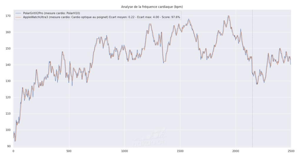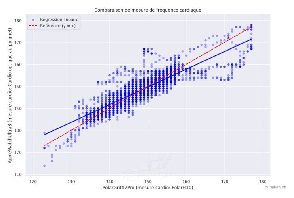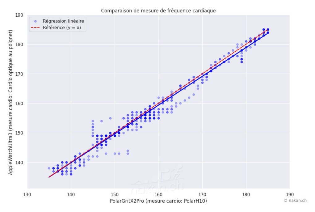 J’ai utilisé la montre dans différentes conditions, dans différentes activités sportives et j’ai comparé les mesures de l’Apple Watch Ultra 3 avec les mesures de la ceinture Polar H10 couplée à différents appareils. Il est à noter que les tests de l’Apple Watch ayant traditionnellement lieu en automne, cette saison est plus fraîche et donc moins favorable pour les capteurs optiques que pour les appareils testés en été…
