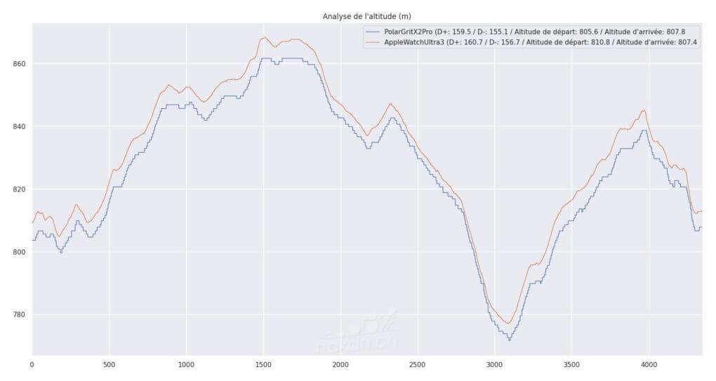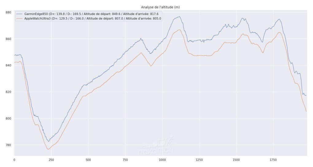 Lors de cette activité de course à pied, j’ai couru avec la Polar Grit X2 Pro et l’Apple Watch Ultra 3. Voici les courbes d’altitude mesurées par les deux montres: