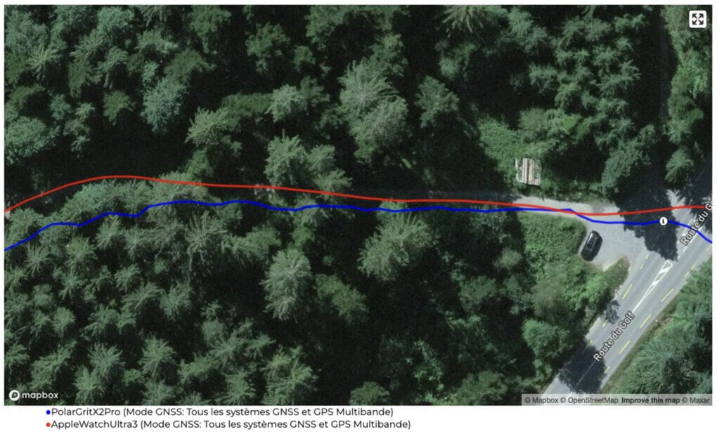 Lors de ce premier comparatif, j’effectue 4 tours d’un petit circuit d’environ 450m en sous-bois. La trace permet ensuite de voir la régularité de la mesure de la montre. J’ai réalisé ce test une première fois, mais de retour à la maison, je me suis rendu compte que l’Apple Watch Ultra 3 avait fait une magnifique sortie de route sur l’un des tours de la boucle (à gauche). Afin de savoir si cette erreur revenait de manière récurrente, j’ai effectué une nouvelle fois le test quelques jours plus tard (à droite), et là, plus aucune erreur… Problème ponctuel probablement, même si il est toujours très délicat de comparer deux traces GPS réalisées à un moment différent, puisque la disposition des satellites disponibles dans le ciel est toujours différente…