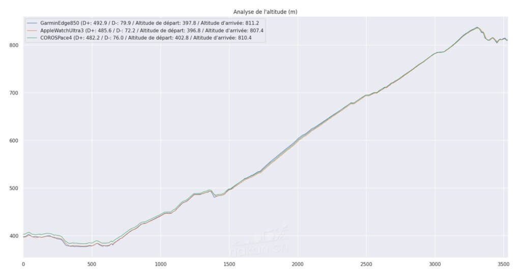 Les 3 appareils ont des courbes qui se superposent quasi parfaitement si on excepte le départ de la Pace 4 qui a légèrement sur-évalué l’altitude au démarrage. Ensuite, le dénivelé cumulé tant positif que négatif est cohérent entre les 3 mesures. Garmin fournit habituellement des valeurs légèrement sur-évaluées. L’altitude d’arrivée de l’Apple Watch Ultra 3 est légèrement plus basse, mais c’est à cause d’une petite erreur de manipulation qui a interrompu l’enregistrement sur la montre un tout petit peu plus tard… La mesure est donc également ici considérée comme excellente!