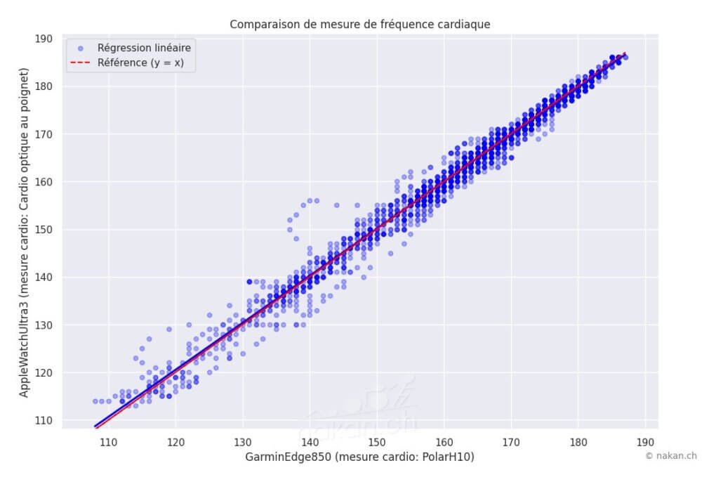 On voit que la mesure est quasiment parfaite, ce qui n’est pas si courant à vélo… L’écart maximal est de 11bpm, et l’écart moyen de seulement 0.29 bpm, pour un score final de 93.5% ce qui est quasiment un score de comparaison de deux ceintures. Le graphique de régression montre que la mesure est excellente dans toutes les plages de fréquence cardiaque: