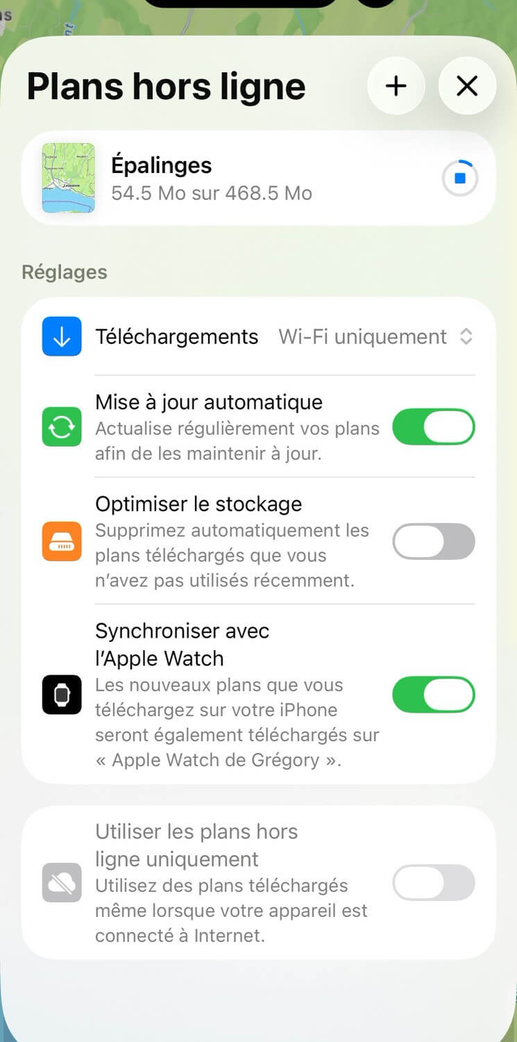Nativement sur la montre, l’app Plans de Apple permet de stocker de la cartographie hors ligne sur le téléphone et la montre, et de naviguer en suivi d’itinéraire.