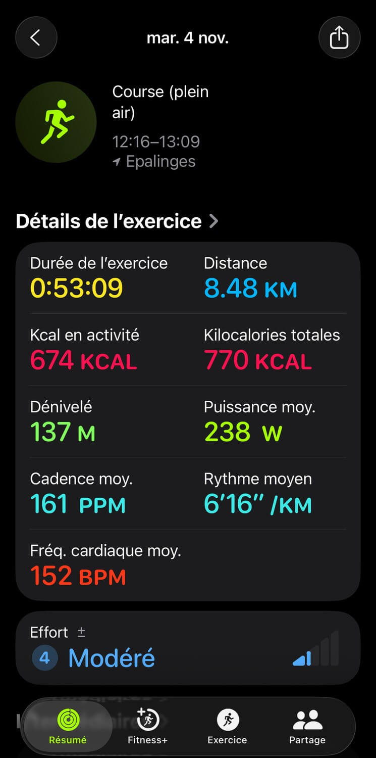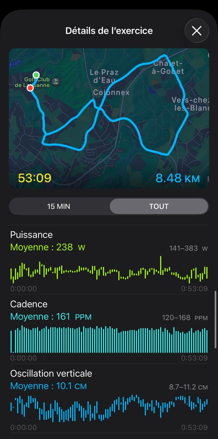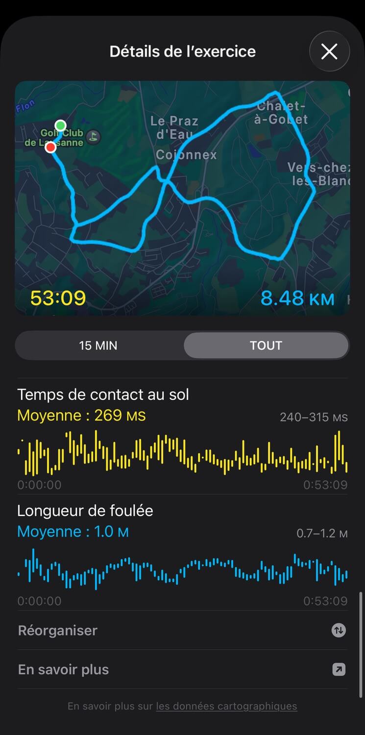 Lors de cette séance de course à pied, j’ai fait varier les intensités, surtout sur la fin, pour voir comment réagissait le capteur de l’Apple Watch Ultra 3 à ce type de séance: