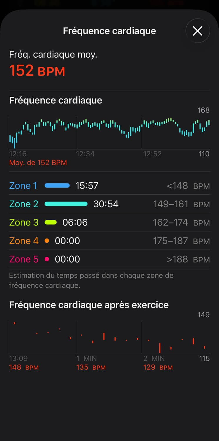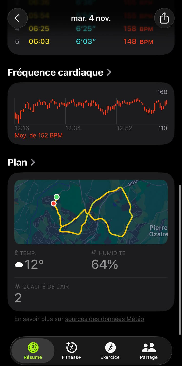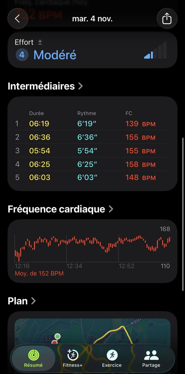 Lors de cette séance de course à pied, j’ai fait varier les intensités, surtout sur la fin, pour voir comment réagissait le capteur de l’Apple Watch Ultra 3 à ce type de séance: