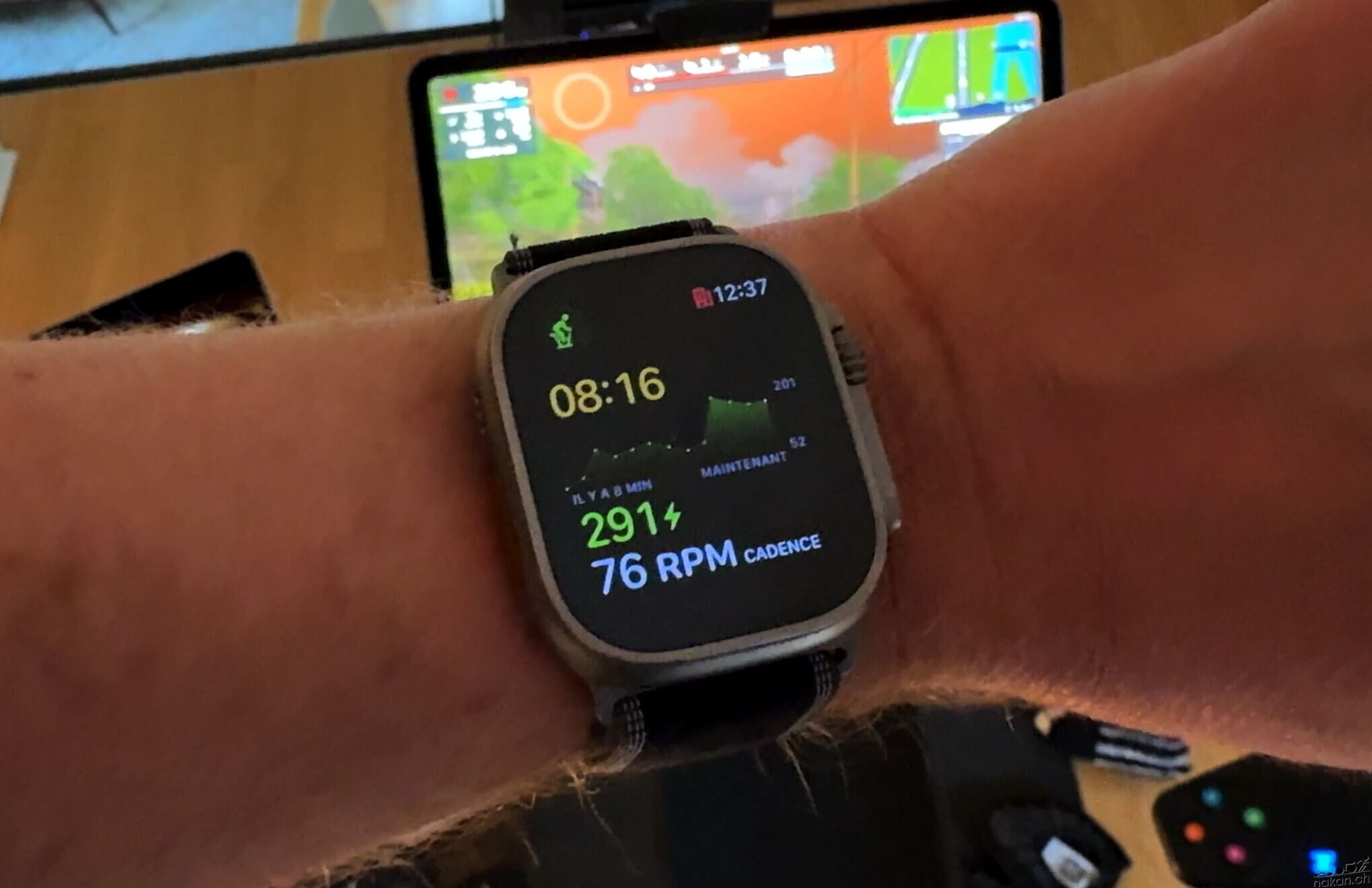 L’objectif de ces comparatifs ici est de montrer l’excellente mesure de l’Apple Watch Ultra 3 sur les activités de sport en intérieur, cette montre étant régulièrement vue aux poignets des sportifs dans ma salle de fitness par exemple. J’ai donc compilé 3 activités indoor différentes et les graphiques associés. On commence avec une excellente mesure sur le home trainer: