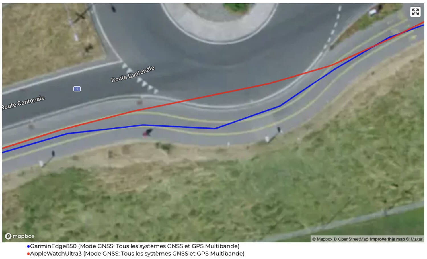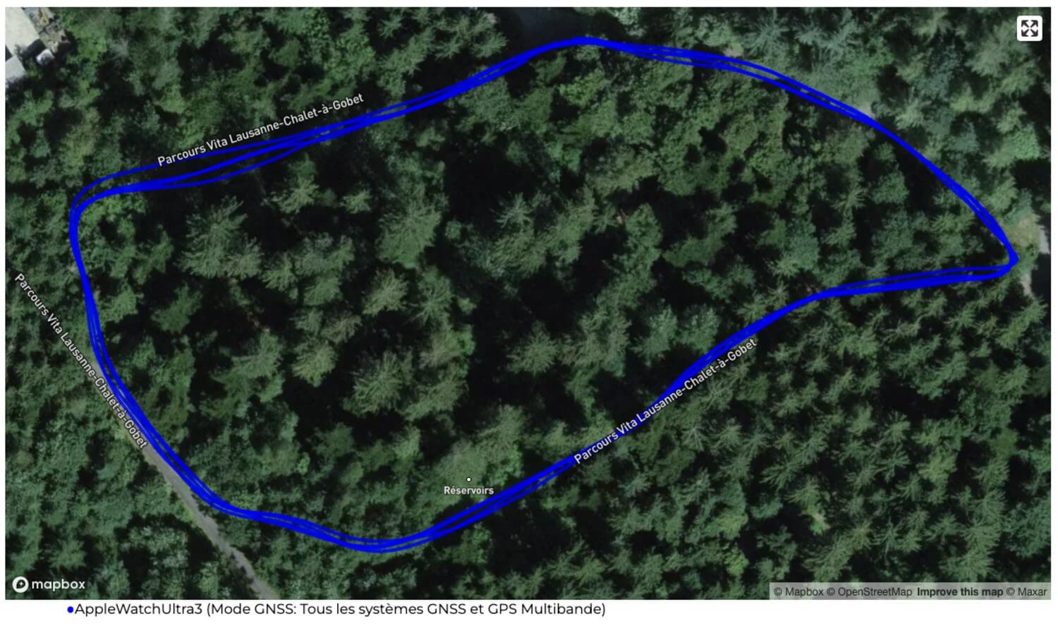 Lors de cette activité, j’ai utilisé mon vélo pour rentrer du travail à travers la ville de Lausanne. La trace de l’Apple Watch Ultra 3 est ici comparée à celle du compteur cycliste Edge 850 de Garmin. Globalement, les deux traces sur l’ensemble du parcours sont très bonnes. Mais on note par endroits des petits écarts de l’Apple Watch qui montre une trace avec très légèrement moins de précision que le compteur. Il faut tout de même garder à l’esprit que la montre était portée au poignet, alors que le compteur était posé sur le guidon!