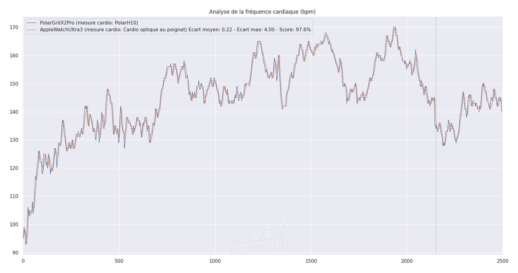 J’ai utilisé la montre dans différentes conditions, dans différentes activités sportives et j’ai comparé les mesures de l’Apple Watch Ultra 3 avec les mesures de la ceinture Polar H10 couplée à différents appareils. Il est à noter que les tests de l’Apple Watch ayant traditionnellement lieu en automne, cette saison est plus fraîche et donc moins favorable pour les capteurs optiques que pour les appareils testés en été…