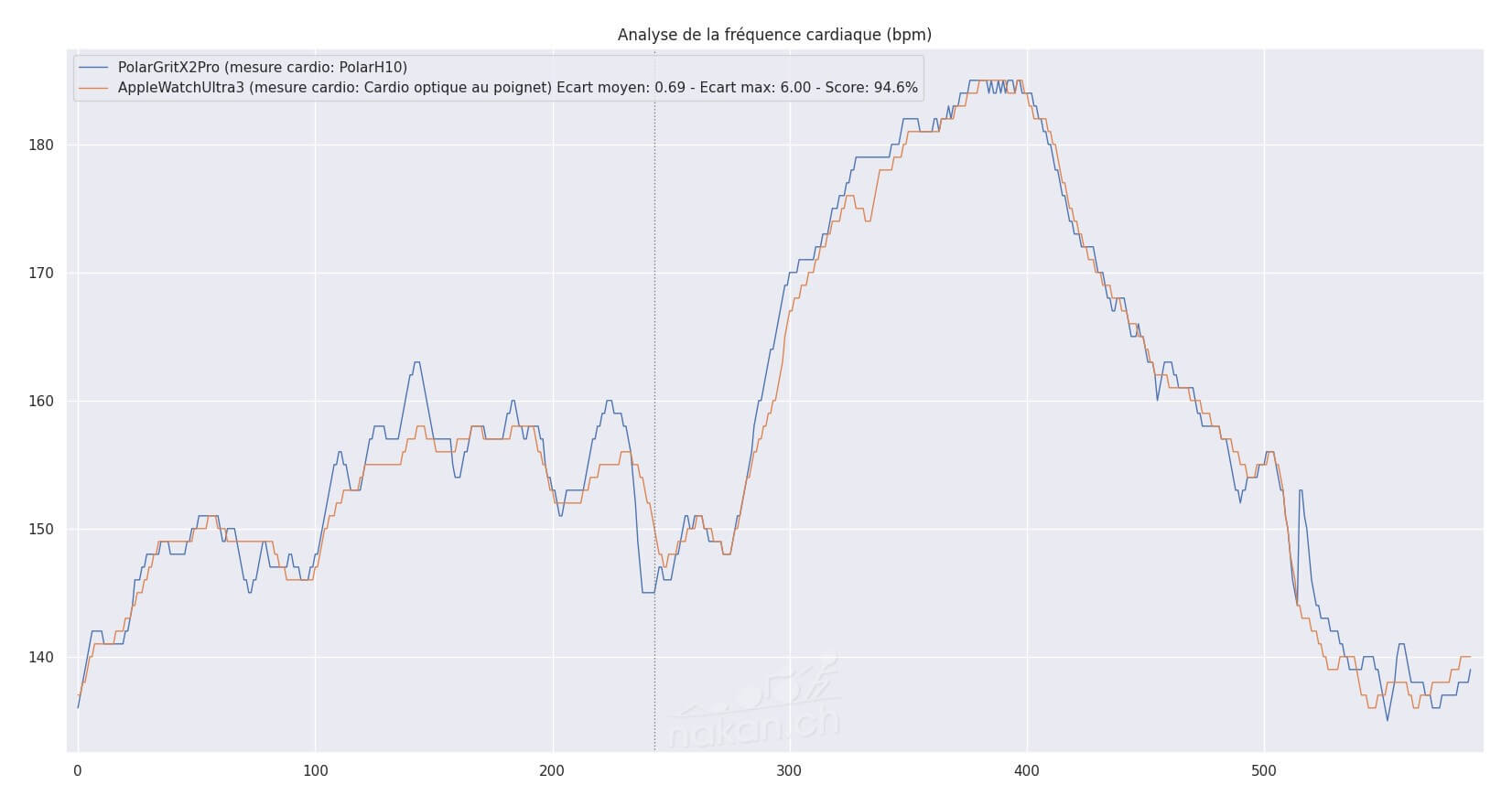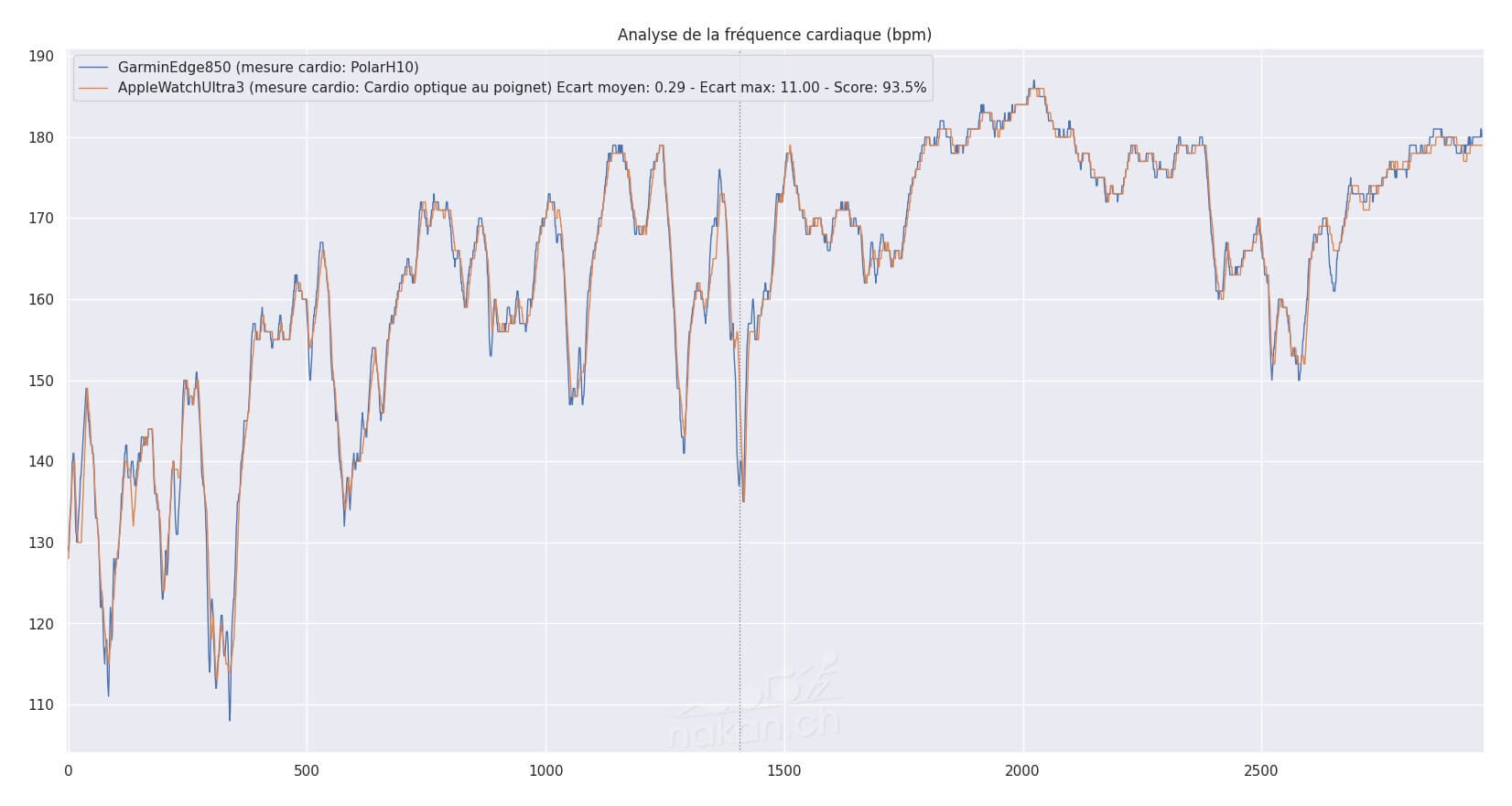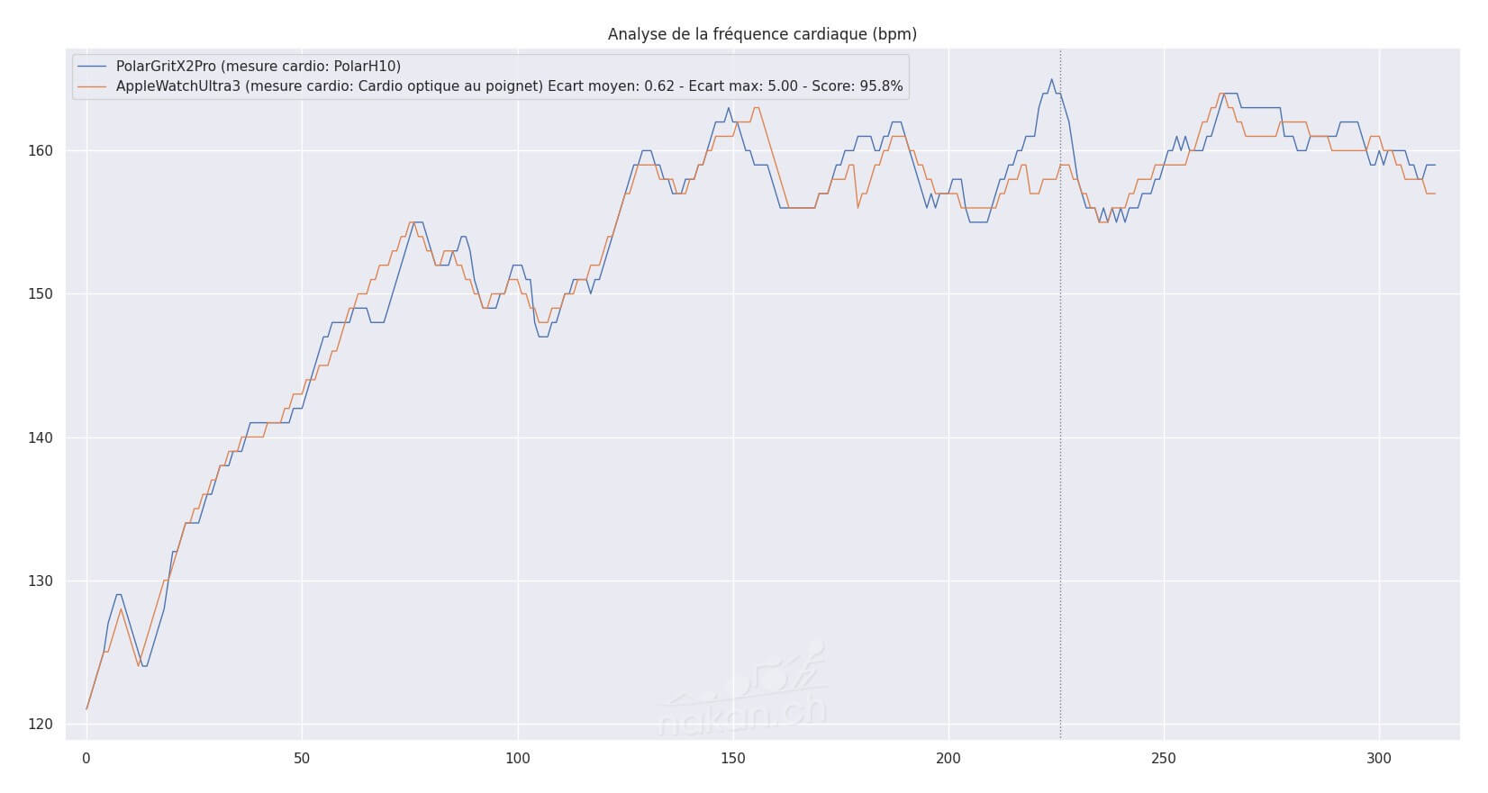 Globalement la mesure a été bonne tout au long de la séance. Mais on voit que lors des accélérations en fin d’activité, la montre a mis du temps à régir. Pour les deux premiers pics, elle a eu du mal à détecter la montée d’intensité, alors que sur la dernière, elle a eu du mal à descendre. Le score de 77% est assez moyen, c’est surtout l’écart maximal de 18bpm qui pose ici problème.