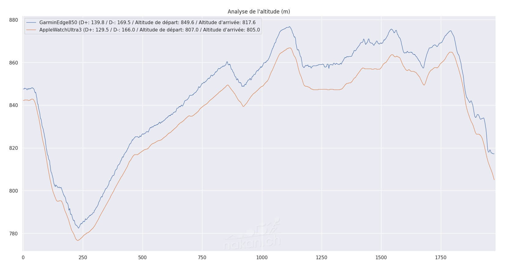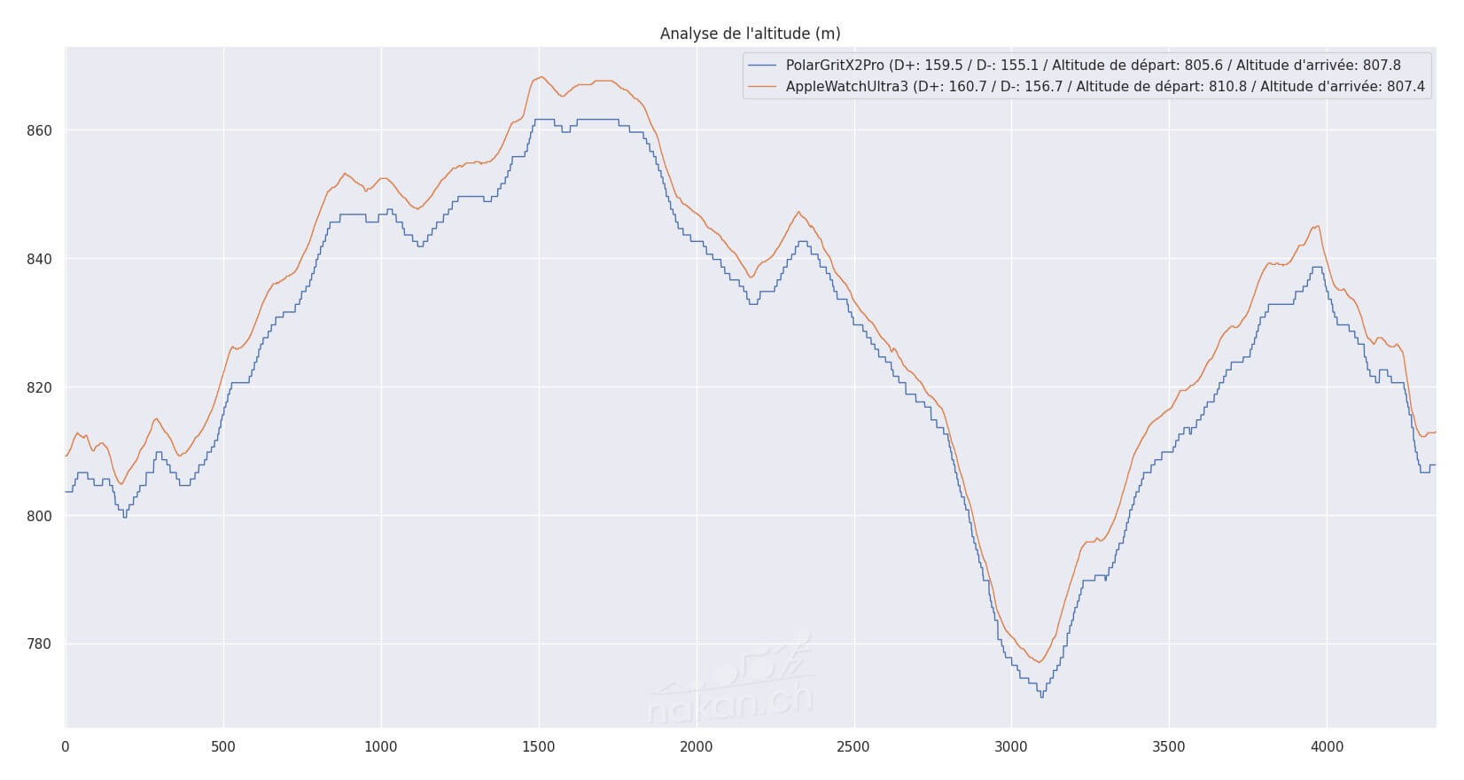 Lors de cette activité de course à pied, j’ai couru avec la Polar Grit X2 Pro et l’Apple Watch Ultra 3. Voici les courbes d’altitude mesurées par les deux montres:
