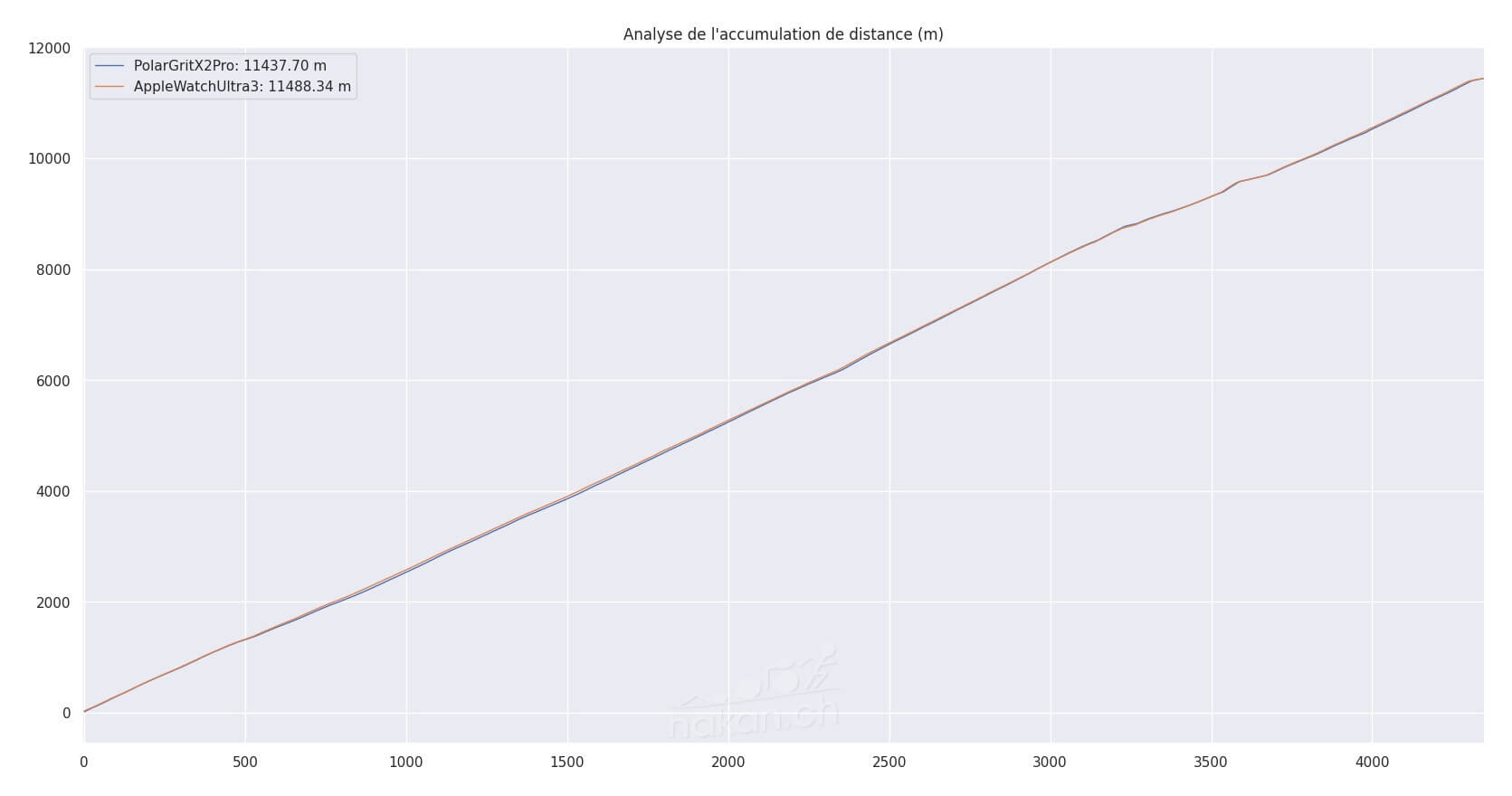 La montre Polar était quant à elle couplée au capteur Stryd, et on note qu’il n’y a aucune différence visible dans l’accumulation de distance entre les deux appareils. La différence finale est de l’ordre de 50m pour 11.5km d’activité.