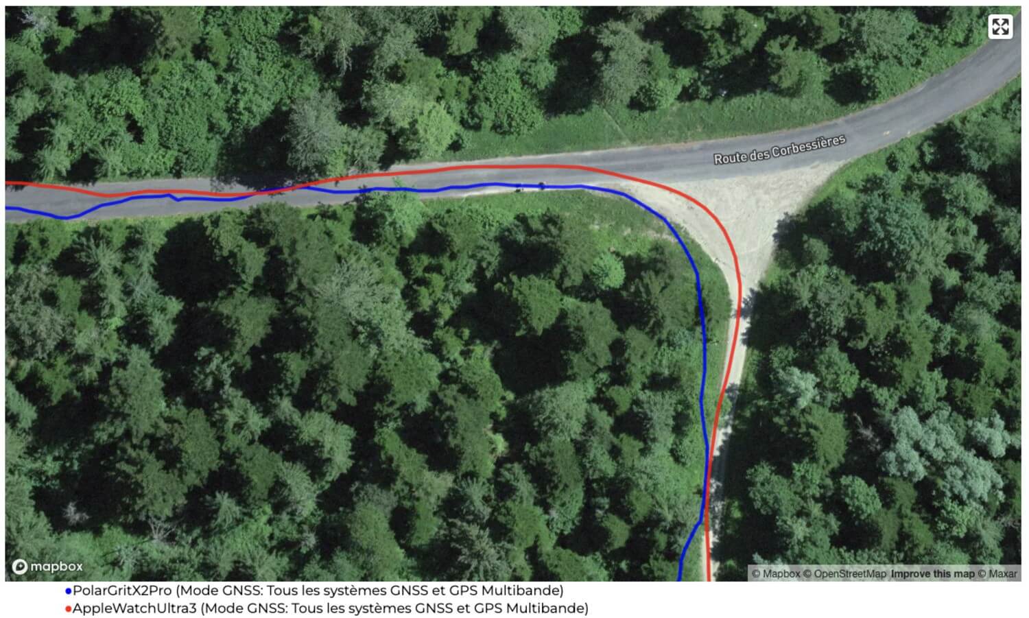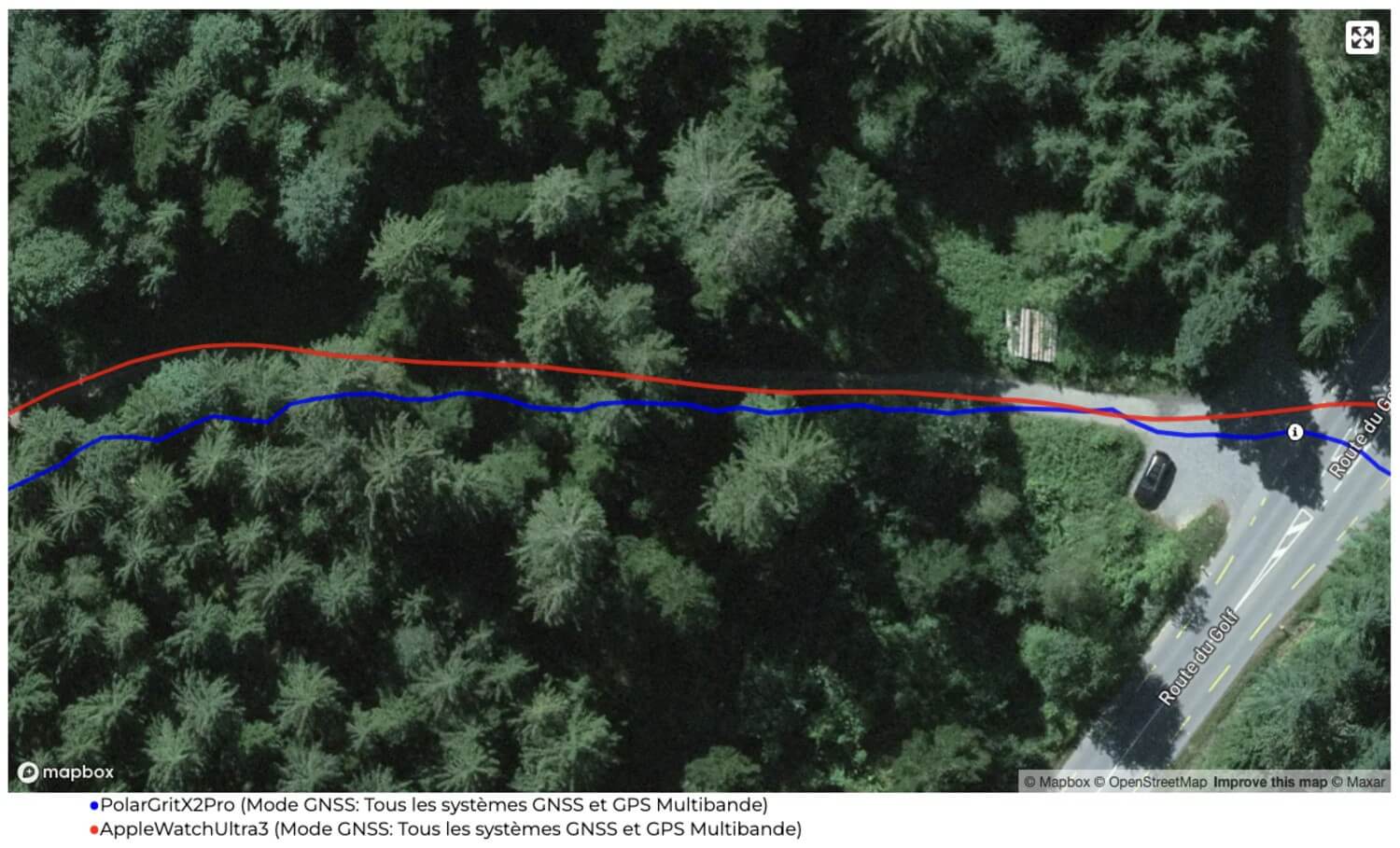 Lors de ce premier comparatif, j’effectue 4 tours d’un petit circuit d’environ 450m en sous-bois. La trace permet ensuite de voir la régularité de la mesure de la montre. J’ai réalisé ce test une première fois, mais de retour à la maison, je me suis rendu compte que l’Apple Watch Ultra 3 avait fait une magnifique sortie de route sur l’un des tours de la boucle (à gauche). Afin de savoir si cette erreur revenait de manière récurrente, j’ai effectué une nouvelle fois le test quelques jours plus tard (à droite), et là, plus aucune erreur… Problème ponctuel probablement, même si il est toujours très délicat de comparer deux traces GPS réalisées à un moment différent, puisque la disposition des satellites disponibles dans le ciel est toujours différente…